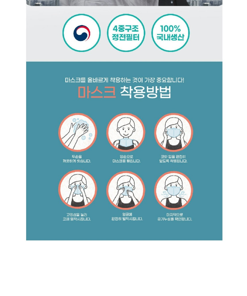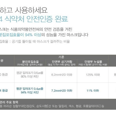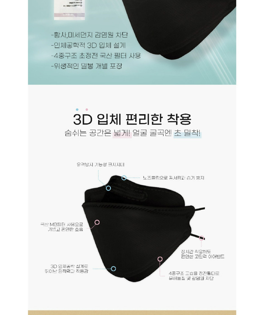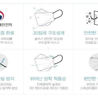 1. 어디서 만든 건가요? 대한민국에서 제조한 상품입니다 2. 비말 차단 기능이 있나요? MB 필터가 포함된 4중 구조로 바이러스 및 비말 차단 기능이 우수한 제품입니다. 3. KF 등급인가요? 해당제품은 식약처 인증을 받은 KF94 등급입니다. 4, 제품구성이 어떻게 되나요? 1매씩 개별포장 50매 박스로 출고됩니다. 대형과 소형을 판매중입니다.