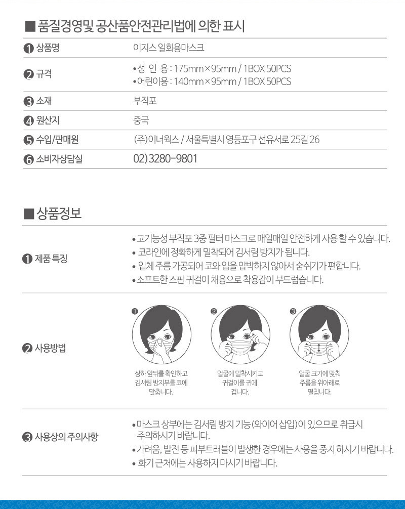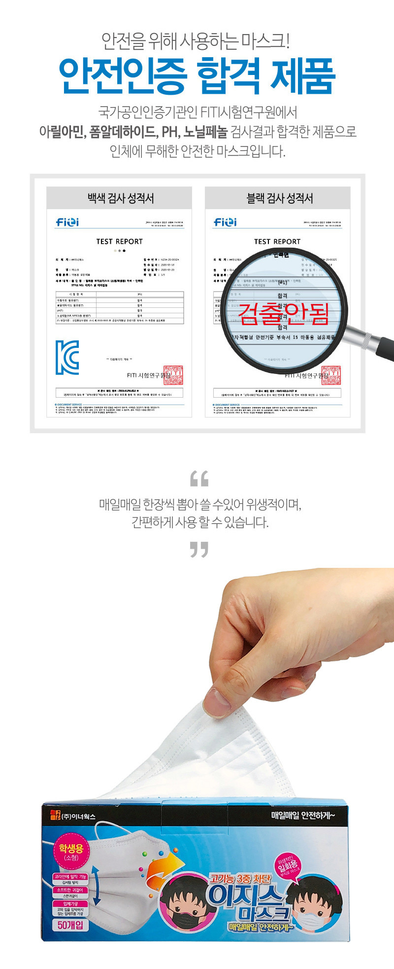 1. 어디서 만든 건가요? 중국에서 제조한 상품입니다 2. 비말 차단 기능이 있나요? MB 필터가 포함된 4중 구조로 비말 차단 기능이 우수한 제품입니다. 3. 품질검사를 받은 제품인가요? 국내 공인기관에서 10가지 품질테스트를 완료한 안전한 제품입니다 어린이제품 안전인증을 받은 제품입니다. 4. 마스크 특징은 무엇인가요? 2중 코지지대가 코에 밀착되어 김서림이 적고 고품질의 정전필터를 사용 하였습니다. 두껍고 튼튼하며 KF94 마스크에 비해 숨쉬기가 편합니다. 품질자신있습니다.
