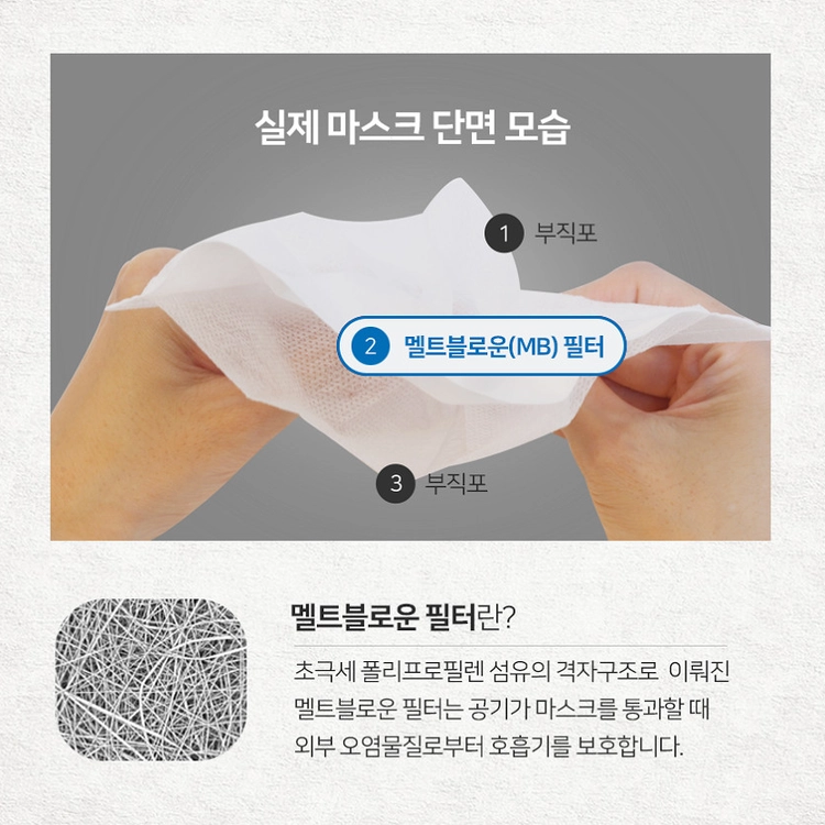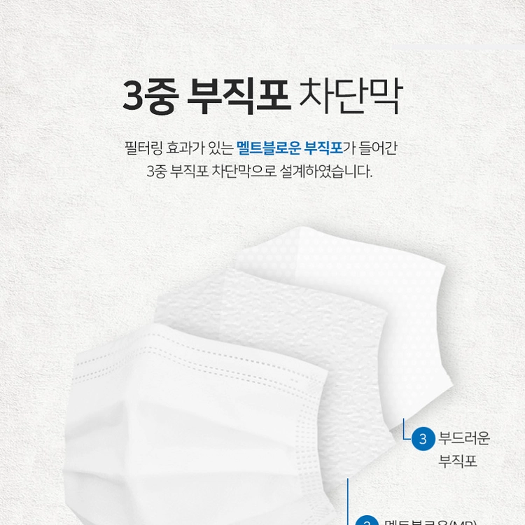 1. 어디서 만든 건가요? 대한민국 에서 제조한 상품입니다 2. 비말 차단 기능이 있나요? MB 필터가 포함된 3중 구조로 바이러스 및 비말 차단 기능이 우수한 제품입니다. 3. 품질검사를 받은 제품인가요? 국내에서 품질검사를 거친 안전한 제품입니다 4. 제품특징이 무엇인가요? 해당제품은 3중구조로 비말차단은 물론 마스크안쪽 감촉이 부드러워 숨쉬기 편합니다 1장에 20원으로 가성비 좋은 상품입니다. 5, 마스크 상품을 선택할수있나요? 재고수급에 맞춰 상품을 보내드리고 있습니다 국산제조/3중필터/일회용 마스크 스펙은 동일합니다 공급사 사정에 따라 마스크 패키지는 변경될수있습니다.
